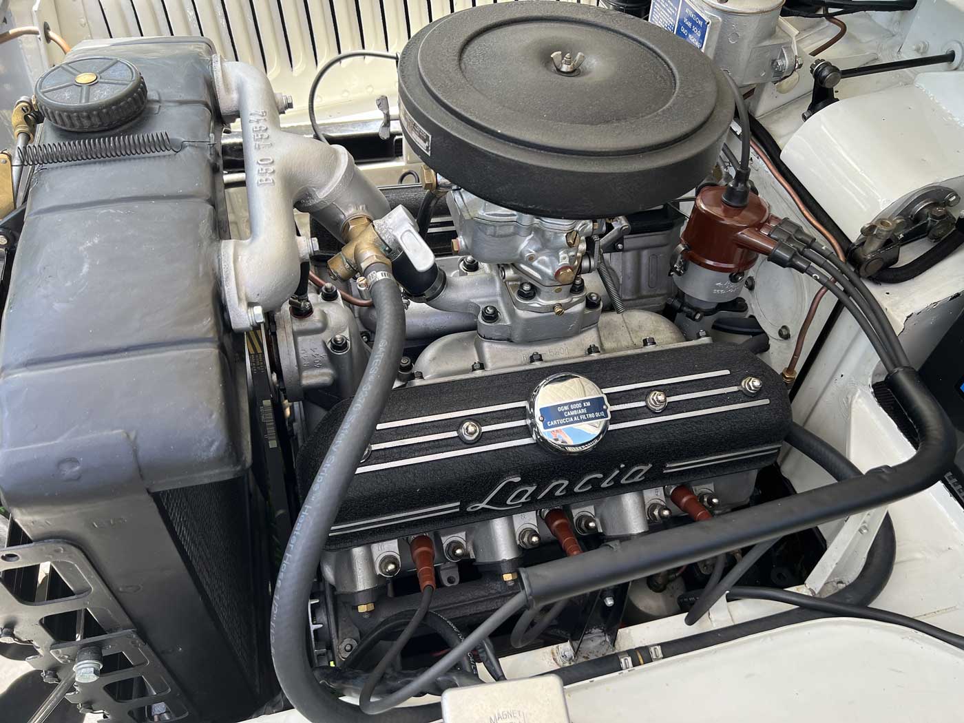 Both cars were built on the B52 Aurelia chassis; the white and blue example is B521055, and the Lugano car is B521061. In the Aurelia history, first was the B10 berlina, at 1574cc, then the B21 with 1991cc, followed by the B20GT coupe, and then the B52, with a 1991cc V-6 and slightly longer wheelbase. Why the B52s were named “B Juniors” is a good question. Only 98 were constructed and sent to various coachbuilders for demanding customers. Some of the most beautiful and evocative Lancias were on the B52 chassis, and included many by Pinin Farina, Bertone, Vignale and others. Ghia bodied these two, reportedly designed by Boano.