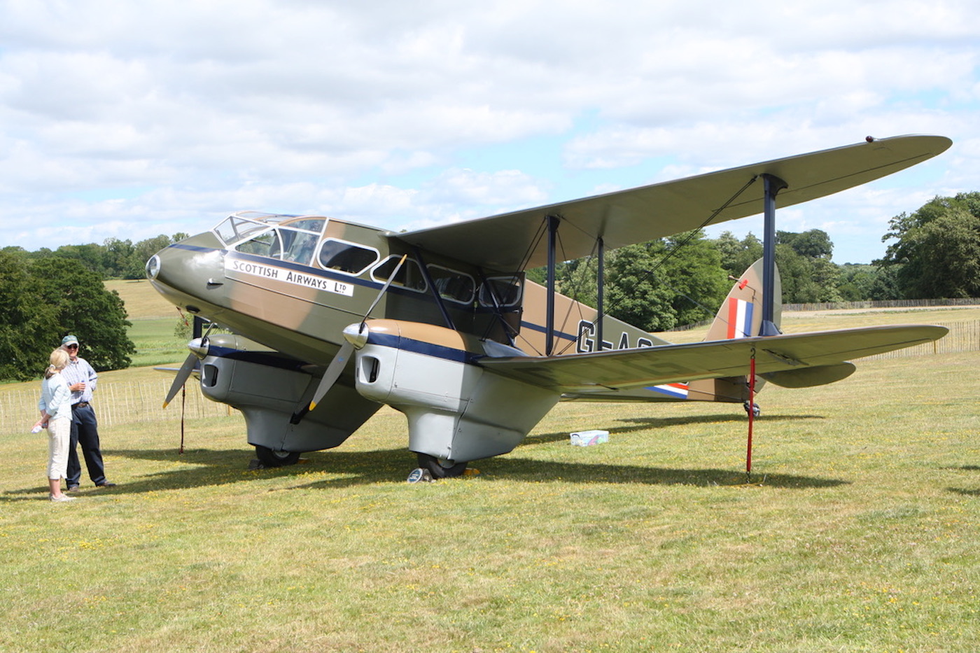 1941 de Havilland DH.89A Dragon Rapide. Built for the RAF, and first used to assess the effectiveness of the camouflage measures at military and industrial sites. In 1943 G-AGJG was transferred to Scottish Airways and began operating flying services in the Highlands and Islands and the odd parachute drop, a role in which she continued in until the 1950s. Discovered at Biggin Hill in a very poor state, probably best described as fire wood, by Mike Donelan from the Duxford Aviation Society (DAS) it was agreed that the group would return the Rapid to the sky and the owner would loan the aircraft to the Society for 20 years. However when the airframe arrived at Duxford it was discovered that the work required was really immense so the deal had to be reconsidered. Ultimately in 1986 DAS members David and Mark Miller were able to purchase the airframe where upon the father and son team set about the mammoth task of restoration, a task that was finally completed in 2004.