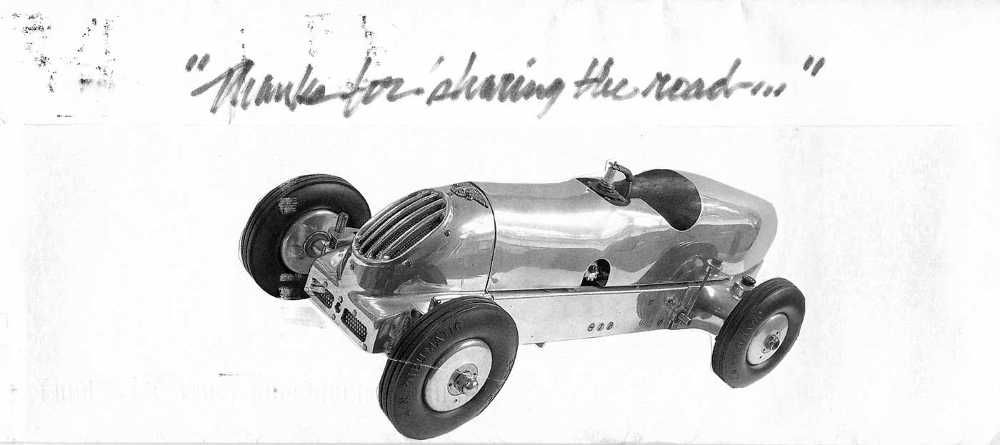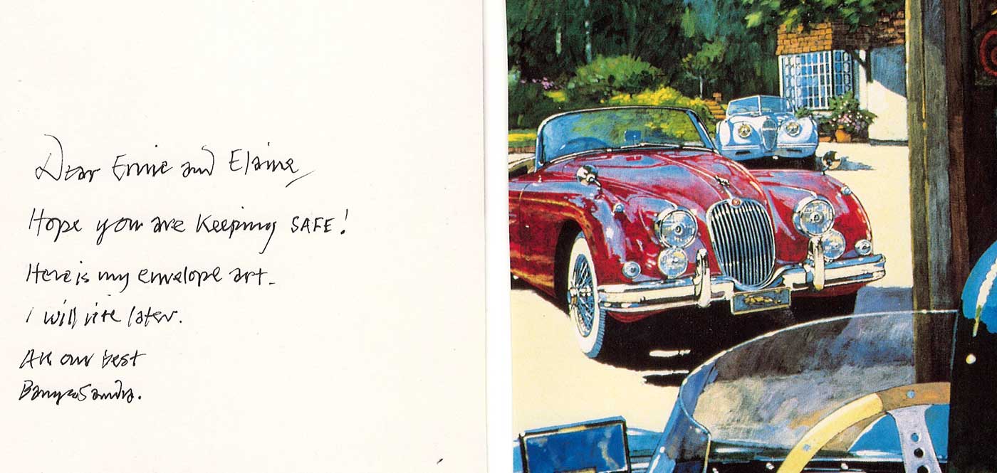 The envelope immediately evokes wonderment, surprise, and smiles and makes risking one’s life to fetch mail from the mailbox near the road worthwhile. It is from vintage racing’s famous ambassador, “Ernie” Nagamatsu and is known as “Mail Art.” We shall let the interested reader Google the subject. Suffice to say Mail Art is a “Pop Art” phenomenon and has been around since the 1960s and is now international in scope.