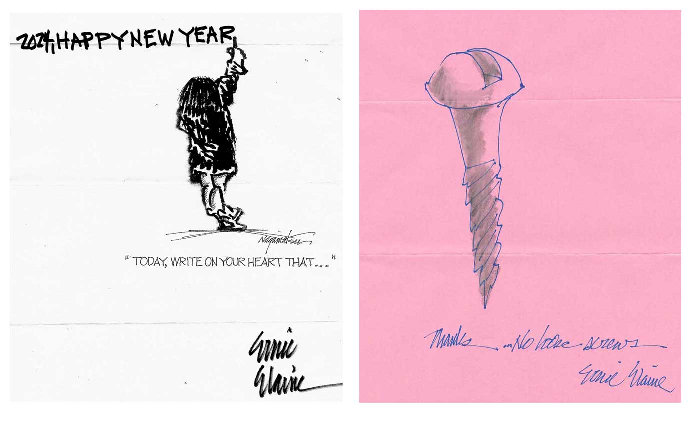 Ernie’s sketches might lead us to examine them a bit closer. For example, later we received a drawing of a girl writing “Happy New Year.” Cute, but it wasn’t until we scanned it for this article that we noticed that as the girl was reaching, striving, the letters began to rise from left to right. The scan revealed a straight line underneath the letters, emphasizing the upward motion of both the words, and raised aspirations for the new year. So this became a message of hope as well as a message of cheer.