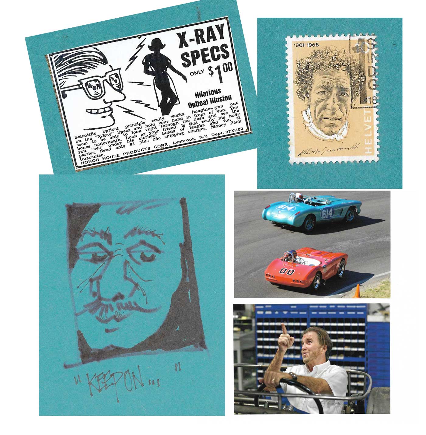 I emailed Ernie and told him his Mail Art was fascinating. Was that really Dali or just someone with a devilish mustache? What was the stamp about? Was the person depicted a famous Italian film editor? How did Ernie know I remembered those Xray glasses? And who was the person in the photograph? I had to do some searching and determined that It was Dave’s son Rich, who helped with the rebuild of the “00” racecar. Ernie had written about 00 and Rich earlier in the year; tragically, Rich would have only a few months more to live.