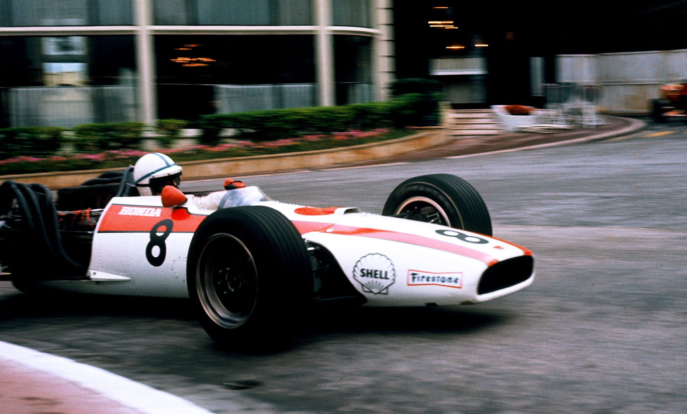 John Surtees, Honda Ra 301, in the Casino Square with the Cafè de Paris in the background. He qualified fourth, 1.29.1, and was out of the race at lap 16.