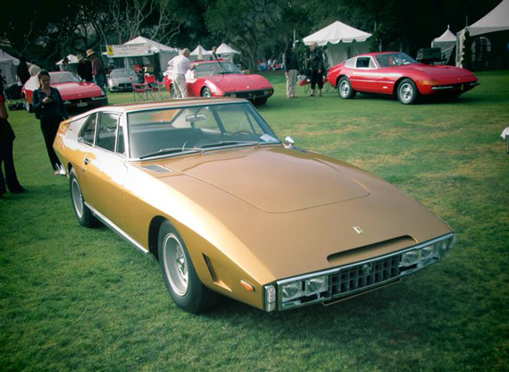 Custom Ferrari was in dubious taste at Concours Italiano but badgework made it seem like it was done decades ago. The shape was similar to Bertone’s Jaguar Piranha.