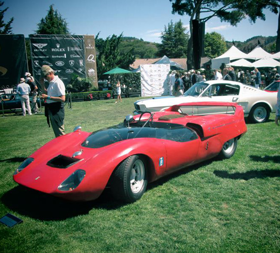 At the Quail was the 70P, a mid-engined car that Peter Brock designed when Shelby and DeTomaso were working together to make what would become a CanAm car. Unfortunately Shelby pulled his funding when he was ordered by Ford to make more Daytona coupes, so DeTomaso brought it out as the 70P, a concept car by Ghia. One or two Comp versions were made but this writer is suspicious of any competition claims since DeTomaso made more race cars that never raced than most other Italian automakers.