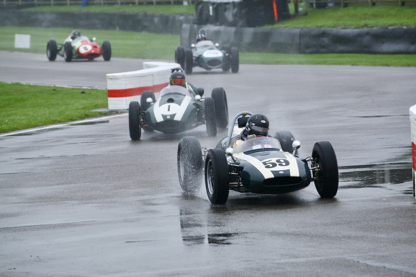 A heavy downpour had soaked the Goodwood track, forming an impressive puddle at the exit of the chicane. It took more than that to impress the driver of this 1938 Maserati 8CTF.