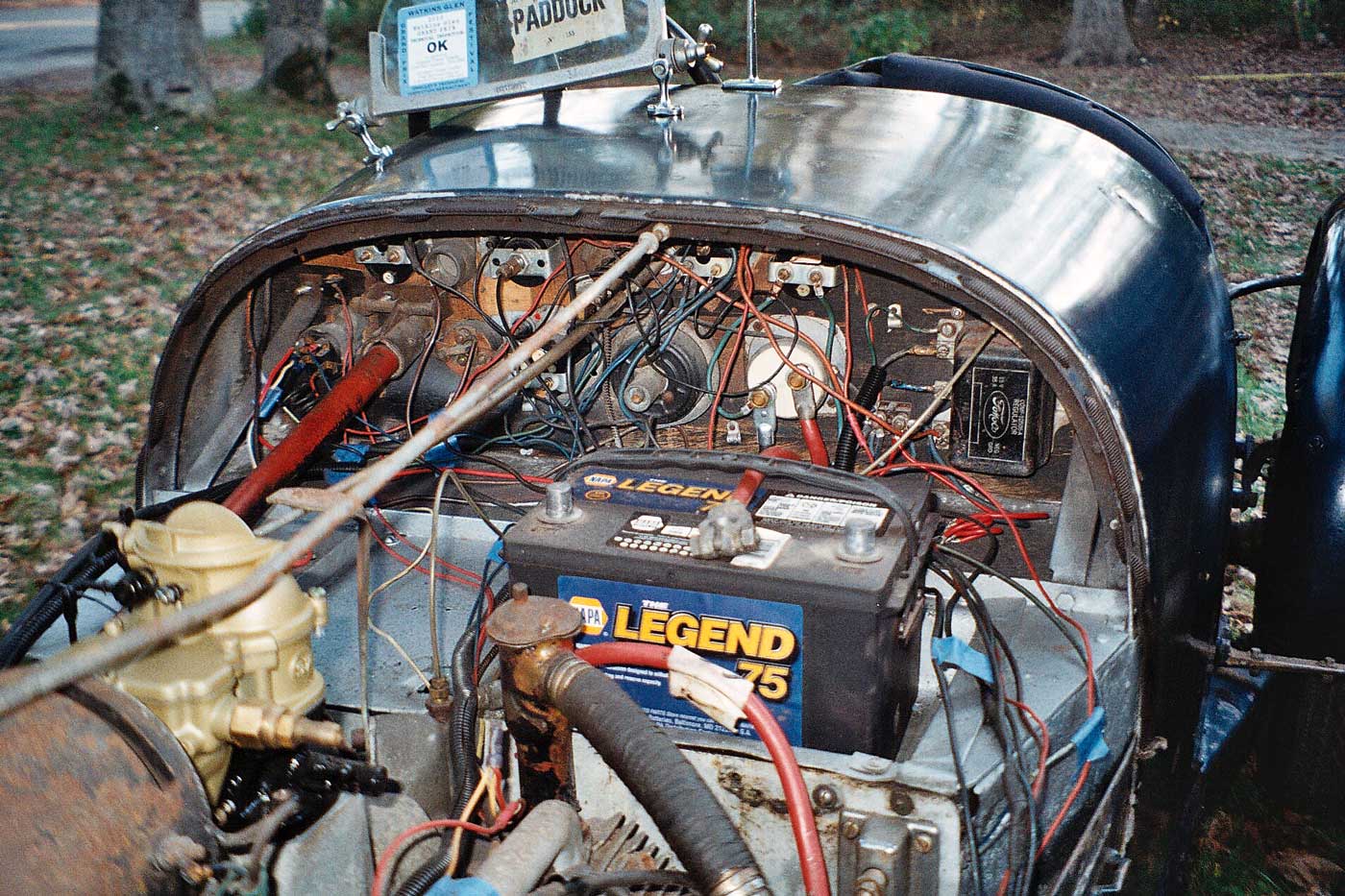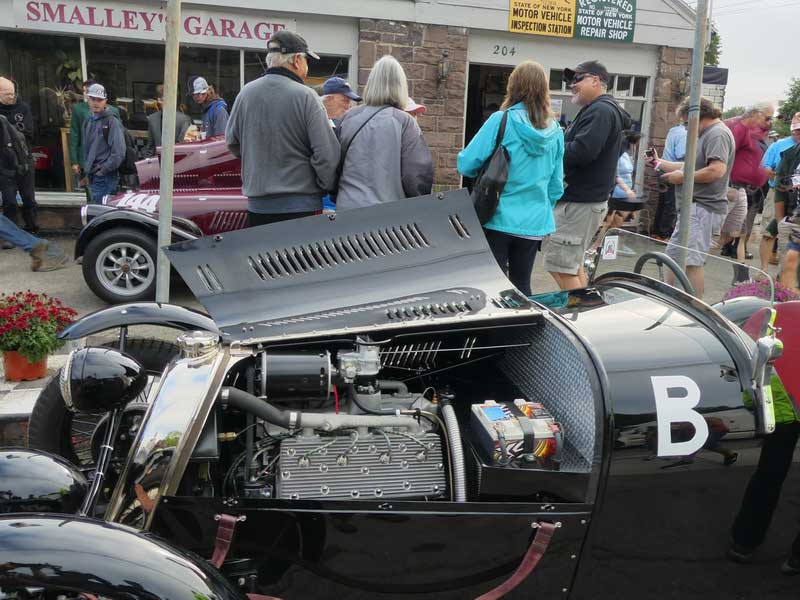 Bonnet off at the Glen. The original aluminum heads were not serviceable, N.O.S. Offenhauser heads, still in the box, were sourced from California.