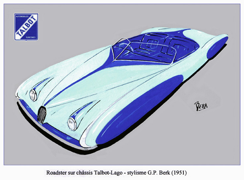This rendering for a Lago-Talbot roadster was very much in the fashion of the French coachbuilders in the early fifties. Afterward I realized that covering front wheels with ‘spats’ was not such a good idea for a sports car as it prevented an optimal cooling of the drum brakes in the front wheels, thus diminishing their efficiency when driving on mountain roads. But it was quite popular with some the French carrossiers.