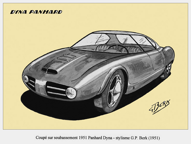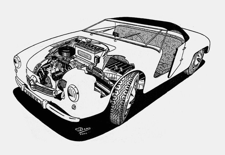 The lightweight chassis platform of the front-wheel drive Panhard Dyna X, with its flat-twin engine could in my opinion also be used for an attractive small two-door sports car or coupé. Around 1950 several French coachbuilders and tuning specialist had the same idea, among them Charles Bonnet of Deutch-Bonnet and Pierre Bourdereau of Monopole. This drawing shows my own concept: a roadster with a panoramic windscreen and a detachable hardtop. In 1952 Panhard introduced their own sports roadster, the Dyna Junior.