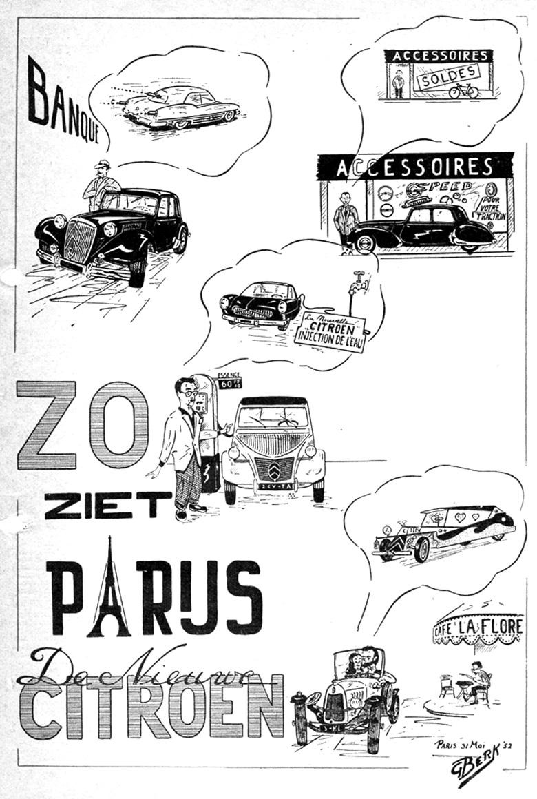In 1952 the French weekly ’l’Autojornal ‘ published spy photos of a camouflaged prototype and a detailed description of what they claimed was to become the successor of the Citroën Traction Avant. The management of the French manufacturer was furious and started juridical actions against its publisher and its editorial staff. The French police even searched their offices to try to find incriminating material. My editor in The Hague asked me for more detailed information. Because the photos in ’l’Autojornal ‘ were not very useful, I drew up this cartoon showing what various French people expected of this new Citroën model and De Auto published it. Five years later, in 1955 the car would be introduced under the name Citroën DS.