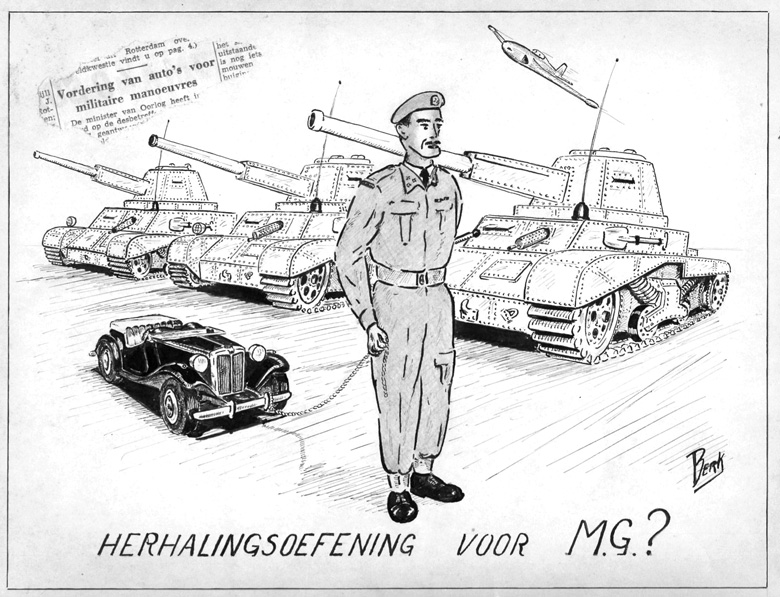 Few people will remember it, but 1953 marked the beginning of what would become known as the Cold war. It started with demonstrations and strikes in East Berlin in protest against their Communist regime and the Soviet army intervened. This led to fears that Russian troops would invade Western Germany and the Low Countries. The Dutch government thereupon announced a plan to requisition private cars for military maneuvers. My stepfather was very worried that his MG would be taken away. For this reason I made this cartoon for him. In the end nothing happened in Western Europe, thanks to the clear warnings to Russia by the American government.