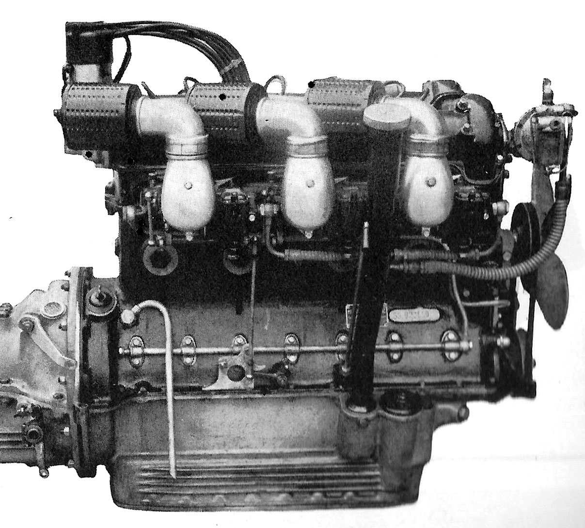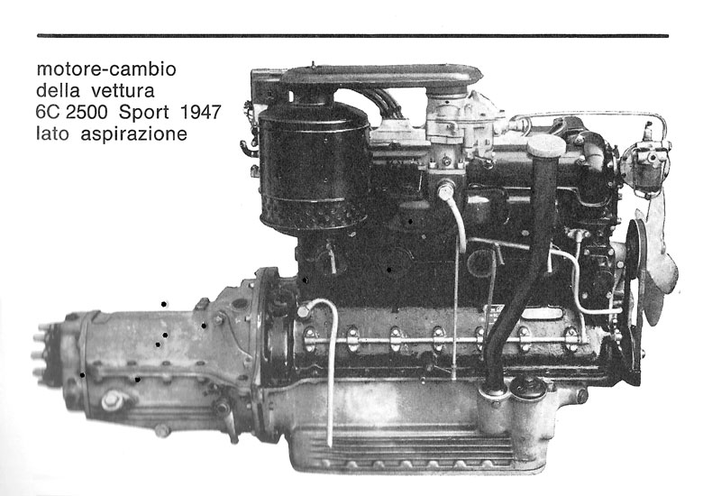 Intake side of a 6C 2500 with a single carb manifold. Note the position of the breather tube and oil filter. (Fusi)
