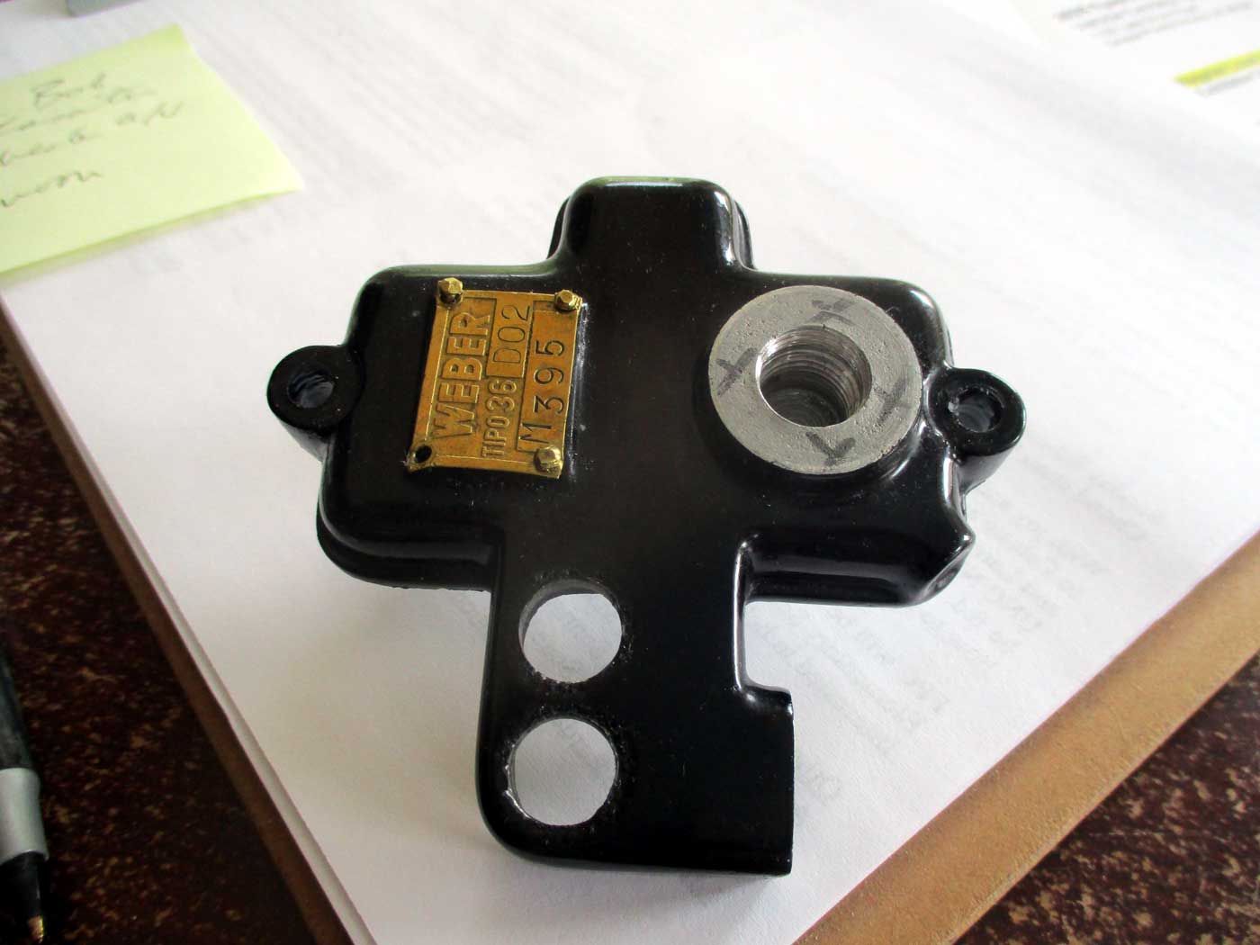 Weber carb top, the Xs indicating the inlet hole and the stripped threads. Try as we might, we could find very little information about this rare single throat side draft Weber. You try.