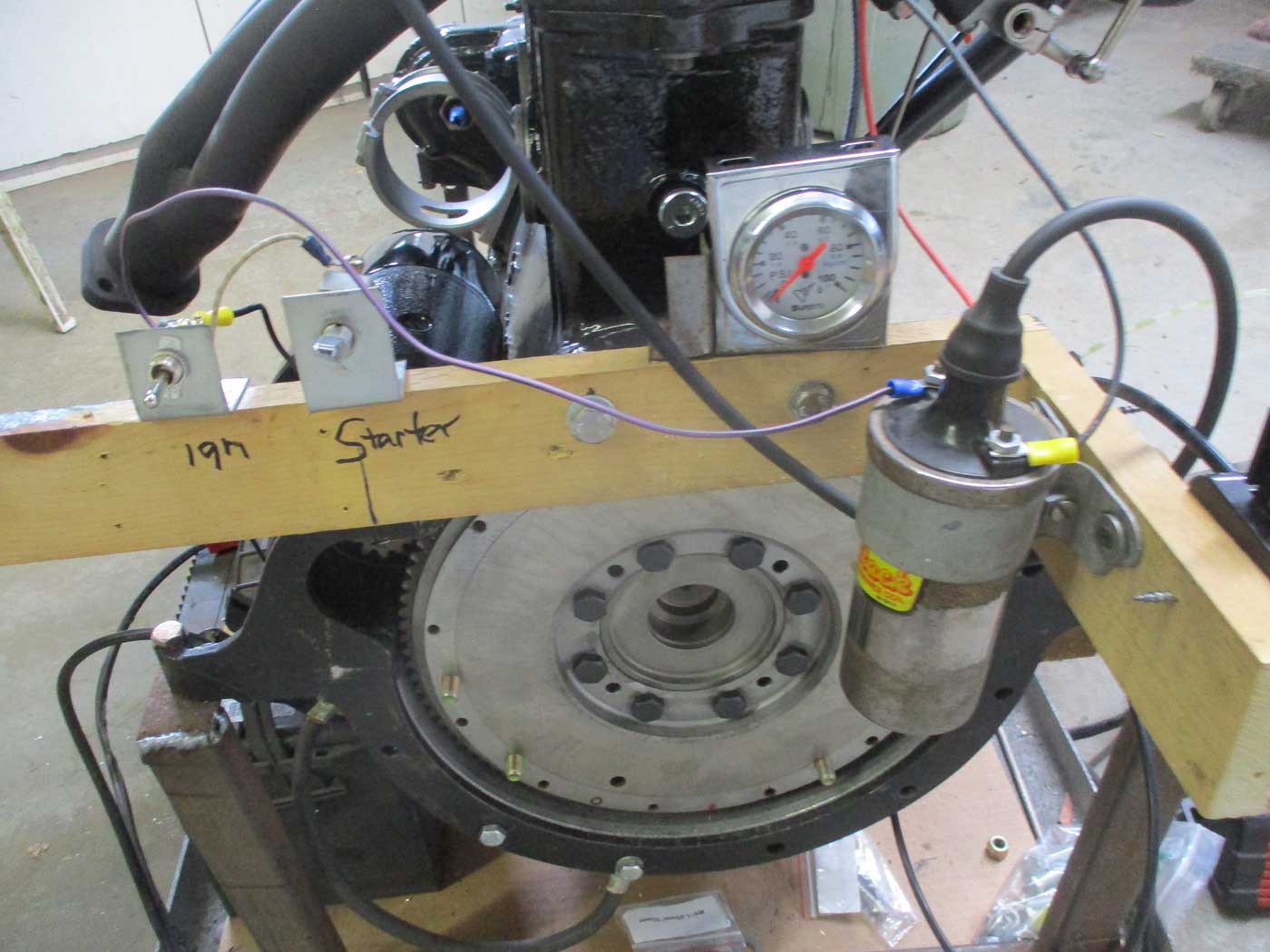 Even to run relatively briefly, the engine needed a fully-equipped test stand: throttle, choke, switches for ignition and starter, coil, oil pressure gauge and hookup, some rudimentary provision for cooling and exhaust. I wasn’t going to run it long enough to need a radiator but wanted the cooling system filled, so I connected hoses so the water could circulate.