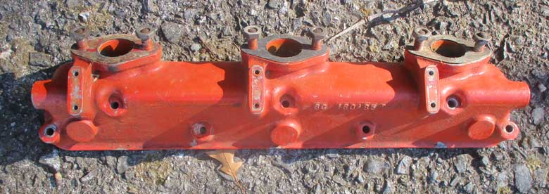 The 6C2500 three carb manifold. The studs were OK for the four lower holes, but not for the top three. We’re not out of the woods, yet.